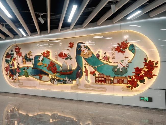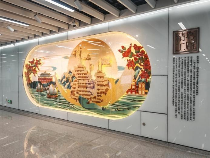 芳村站(荔湾区):主题“粤绣锦华”,着重体现了岭南文化的手工艺精髓,融合了非遗“广绣”与“广雕”,展现了这片土地的精致质感和艺术魅力。