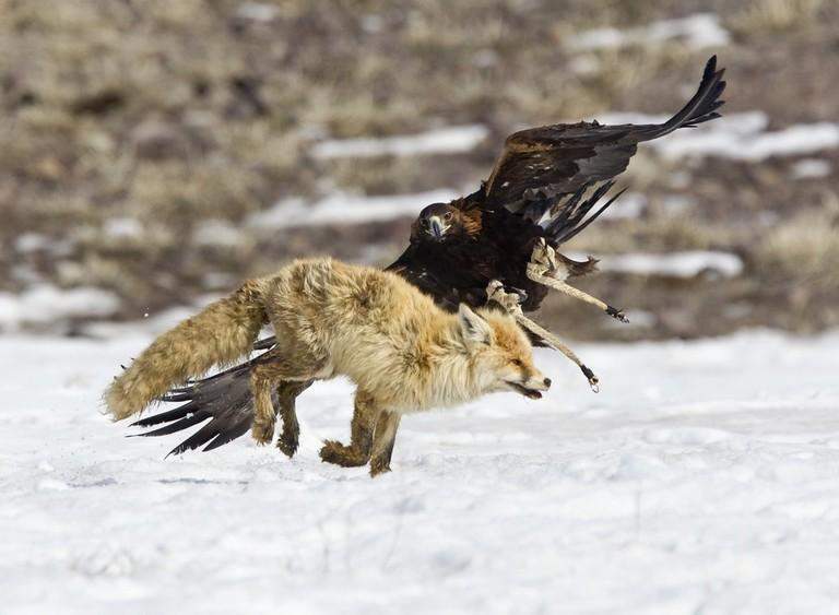 性格孤僻的金雕为何会共同捕猎狼群?研究人员发现,金雕攻击狼群的时候正是西伯利亚最冷的冬季,这个季节金雕的猎物会急剧减少。一只成年狼的体重在30千克以上,对于金雕来说,狼此时就是一个不错的猎物。