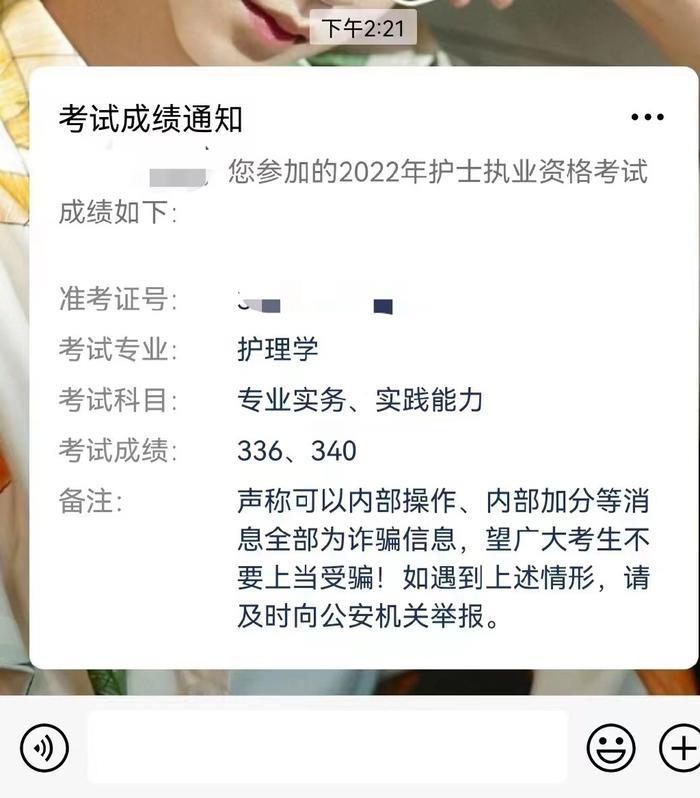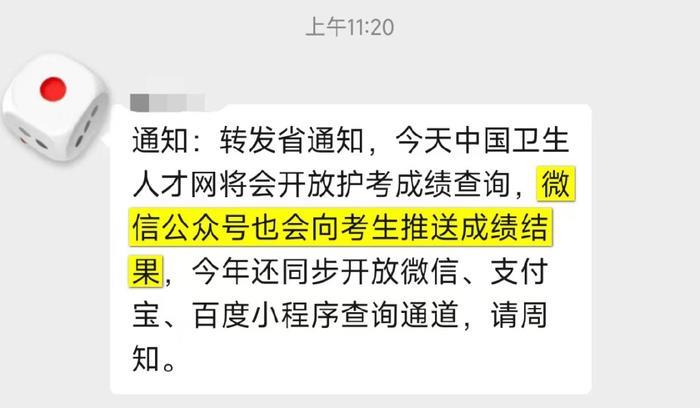 意思是不需要查询,中国卫生人才网微信公众号就会给你推送成绩。执业护士资格考试考生收到的成绩通知则是这样的!