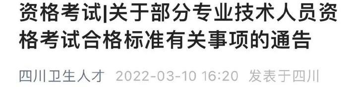 根据人社部通知,自2025年度起,卫生资格考试实行相对固定合格标准,各科目合格标准为试卷满分的60%;若没有特殊情况,合格分数线将保持不变。卫生资格合格分数线为各科60分。但值得注意的是,部分边远地区的省合格分数线会略低一些。省合格线的制定主要是出于帮助一些偏远地区留住人才的考虑。如果考生的分数低于国家规定的分数线,但符合当地的合格分数线,拿到的证书在执业地点方面是有限制的,限定在当地执业。四川省级合格线四川省人力资源和社会保障厅发布:关于部分专业技术人员资格考试合格标准有关事项的通告。
