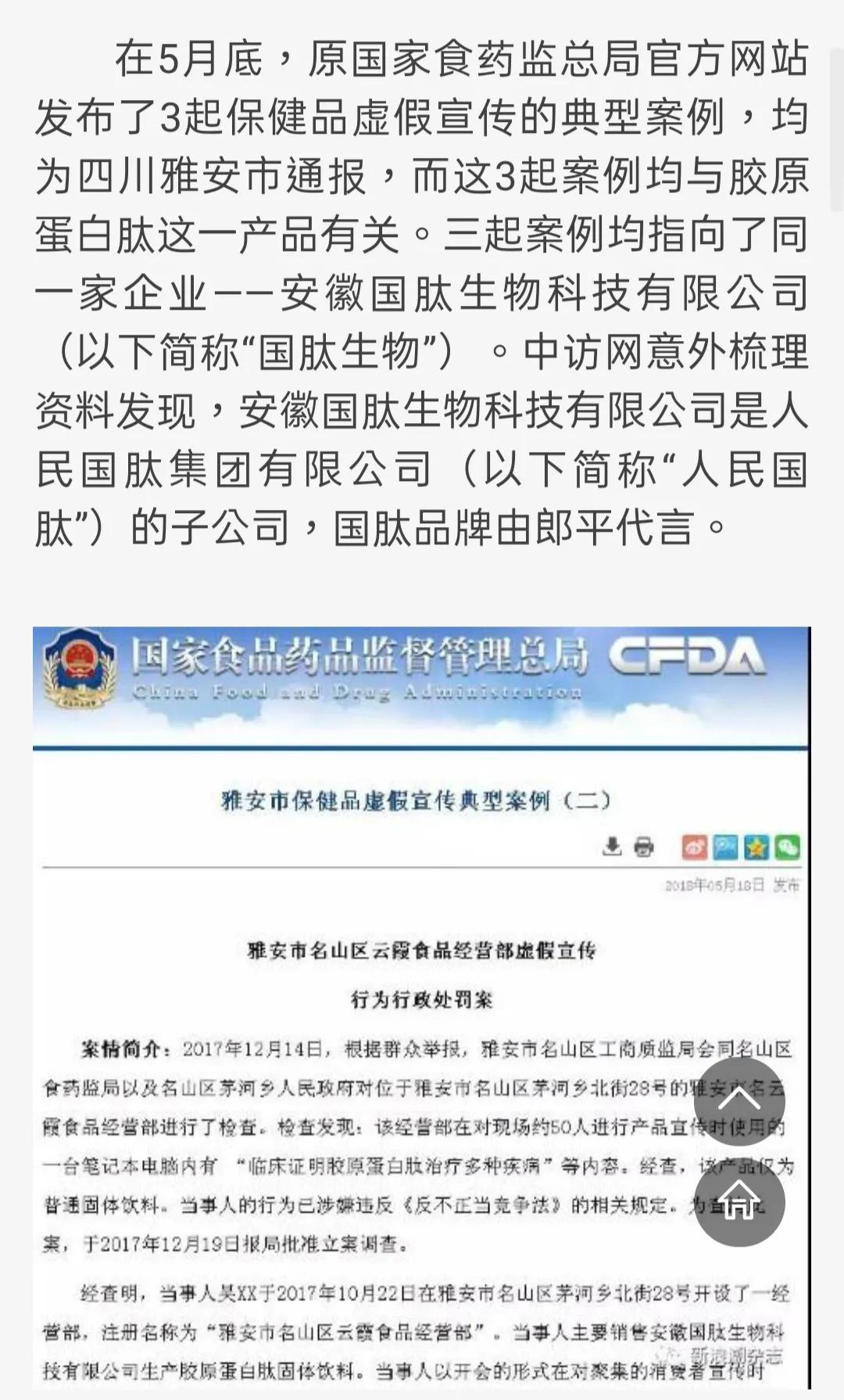 (15)2025年2月,国肽集团正式宣布与郎平成功签约,聘任其为公司首位形象代言人。该公司是一家从事生物活性肽及其健康产品研发、生产、制造、销售的企业。2025年5月,国家市场监管总局曝光国肽生物涉嫌虚假广告。2025年9月,郎平与国肽延续合作,继续担任全球品牌形象代言人。
