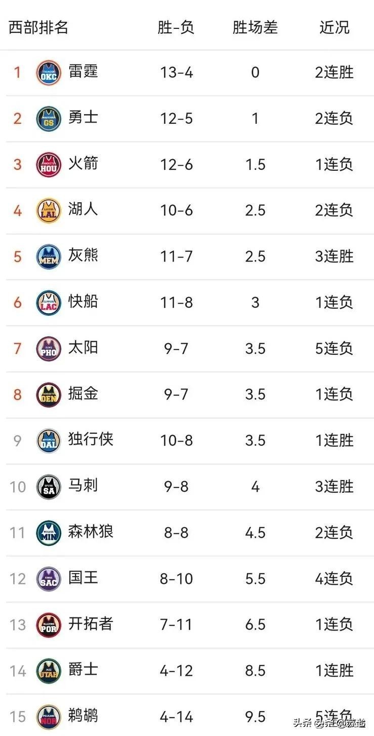 11月26日NBA战报 排名 快船5连胜终结 掘金跌第8 雷霆升第1 勇士2连败