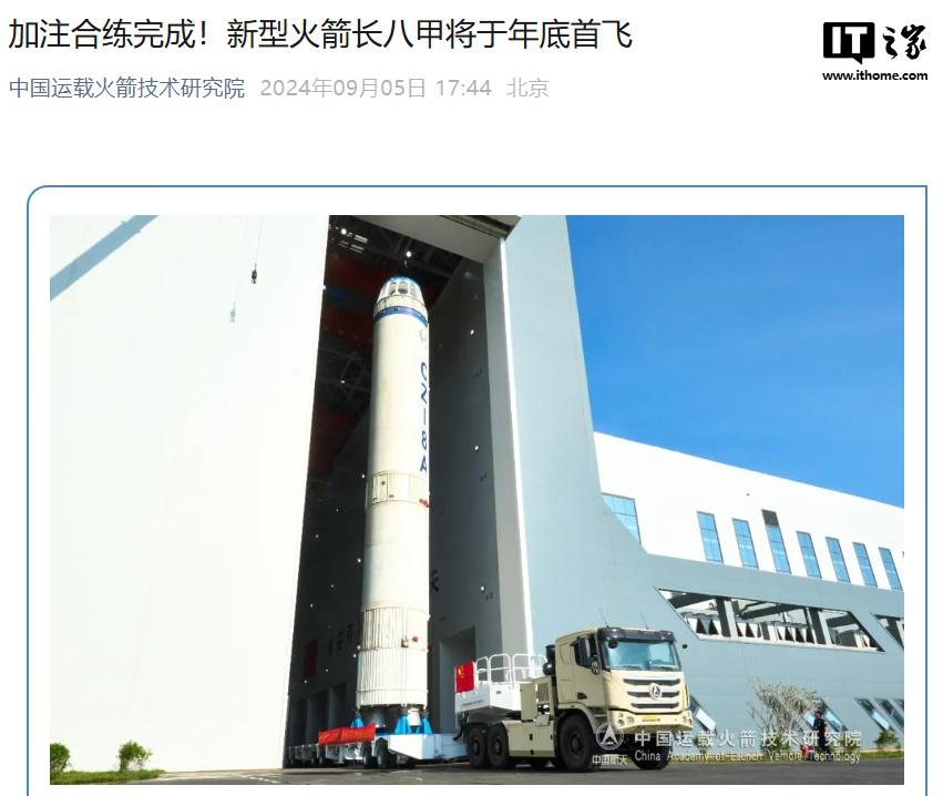 IT 之家 9 月 5 日消息,据中国运载火箭技术研究院(火箭院)今日消息,9 月 4 日,由火箭院抓总研制的新型火箭长征八号甲运载火箭(简称 " 长八甲火箭 ")合练箭在海南商业航天发射场一号发射工位顺利完成发射场合练任务。