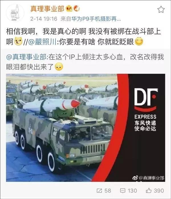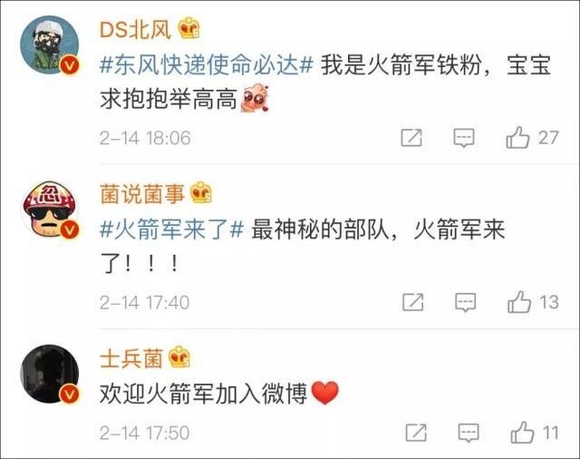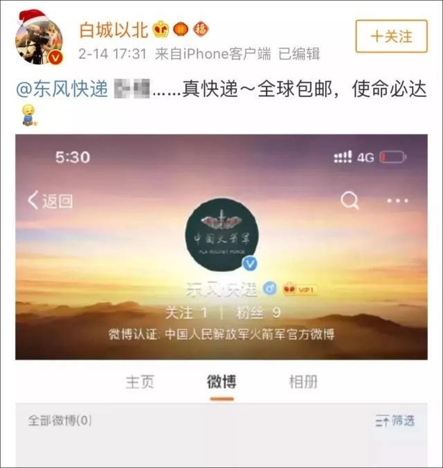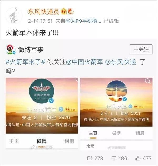 @东风快递和@中国火箭军 虽然只是静悄悄地注册了账号,还没发过任何内容,但粉丝数疯狂上涨,特别是@东风快递,目前粉丝数量已超过5万。网友:官方玩梗,最为致命。