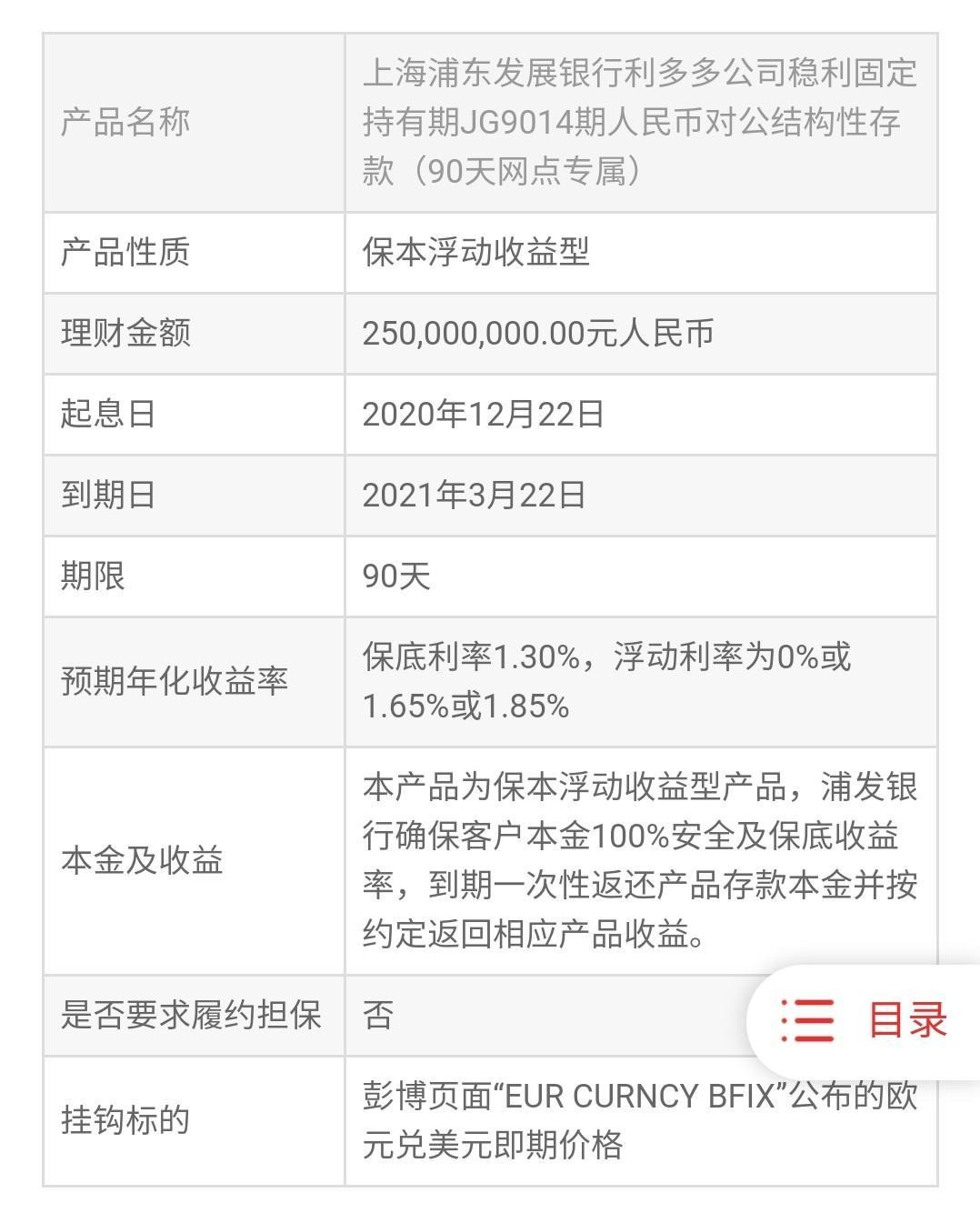●委托理财产品名称:上海浦东发展银行利多多公司稳利固定持有期JG9014期人民币对公结构性存款(90天网点专属)