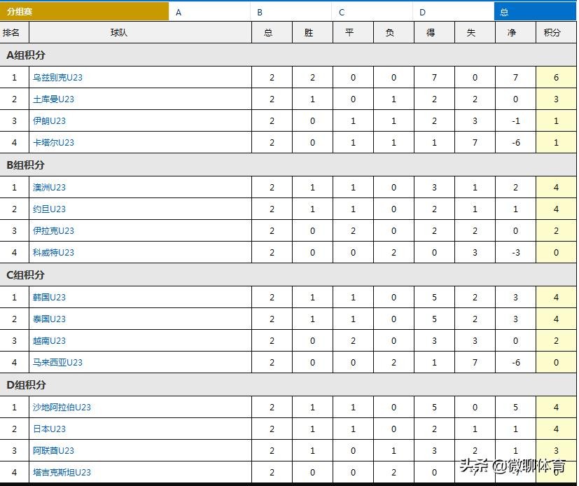 U23亚洲杯小组赛已经进行完两轮,我们看看各组的最新积分榜变动信息和出线前景。