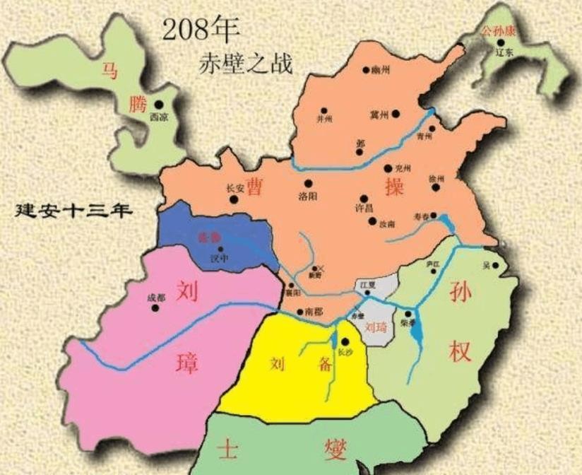 这是公元208年,也就是建安十三年,赤壁大战之后的地形图。跟地图上稍有出入的是,刘备这个时候还没能把荆南四郡全部占据,其实荆南四郡应该标记为橙色,还属于曹操阵营。在孙权和刘备忠建,一小块浅色地区是刘琦所占据的江夏郡。