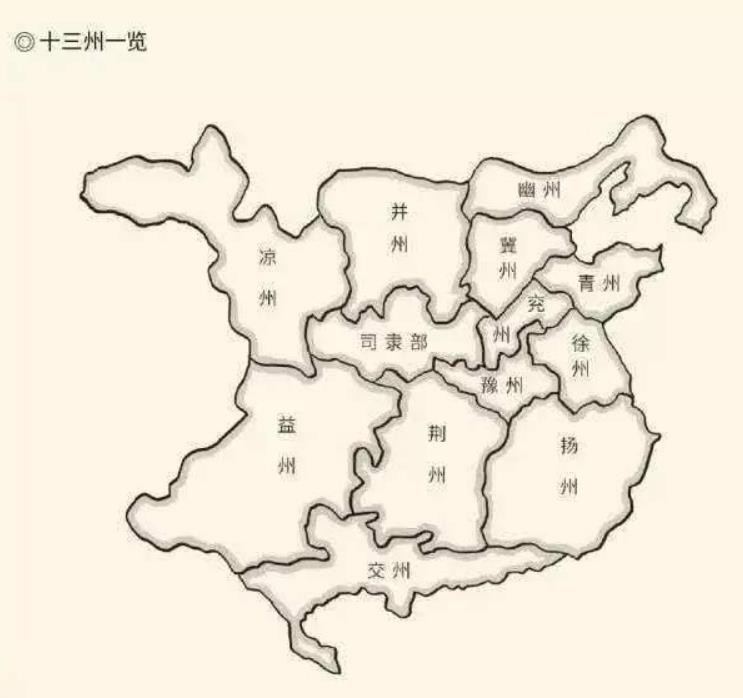 其中十三刺史部分别是:凉州刺史部、并州刺史部、幽州刺史部、冀州刺史部、兖州刺史部、青州刺史部、徐州刺史部、豫州刺史部、益州刺史部、荆州刺史部、扬州刺史部、交州刺史部,以及司隶地区,有时候司隶地区也称为司州。