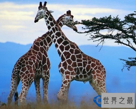 长颈鹿也是一种常见的同性恋动物。在交配前,两头雄性会将自己长长的脖子与对方靠在一起开始亲昵动作。这种示爱行为有时会持续一个小时。