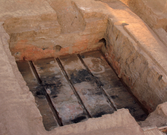 墓室、从葬坑被盗扰后均遭大火焚烧,墓室的红色烧结土最厚处近两米,椁室内西北部有高达1.5米的黑色火烧结核堆积,椁室及各从葬坑的木结构全部被烧毁。