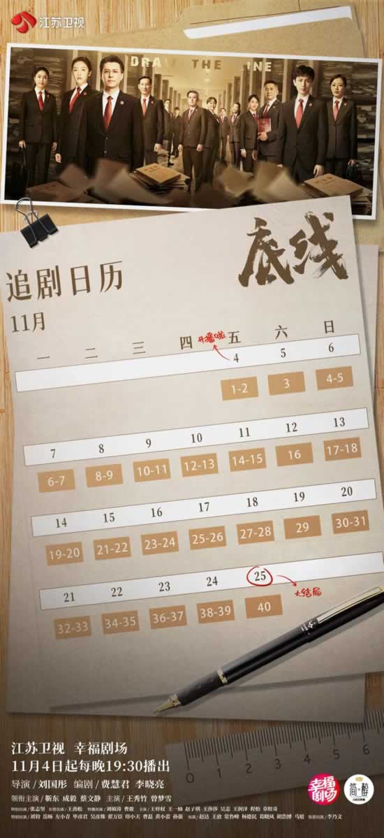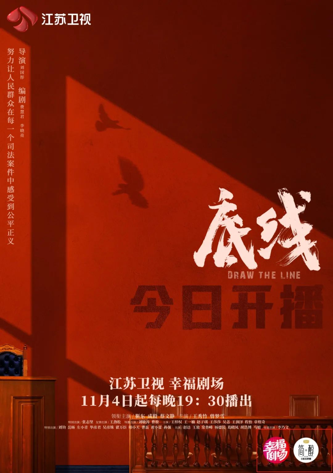 由靳东、成毅、蔡文静领衔主演,张志坚、吴彦姝、翟万臣、毕彦君、王劲松等实力演员倾情加盟的电视剧《底线》,将于今晚(11月4日)起每晚19:30在江苏卫视幸福剧场播出。