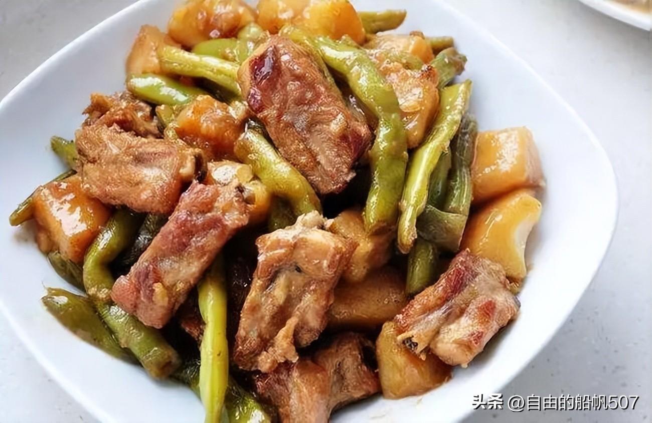 排骨炖豆角是以排骨、豆角为主要食材,葱、姜、蒜、料酒、老抽、花椒、胡椒粉为辅料的家常菜。成菜色泽棕亮,排骨肉烂脱骨,豆角香气清新入味。