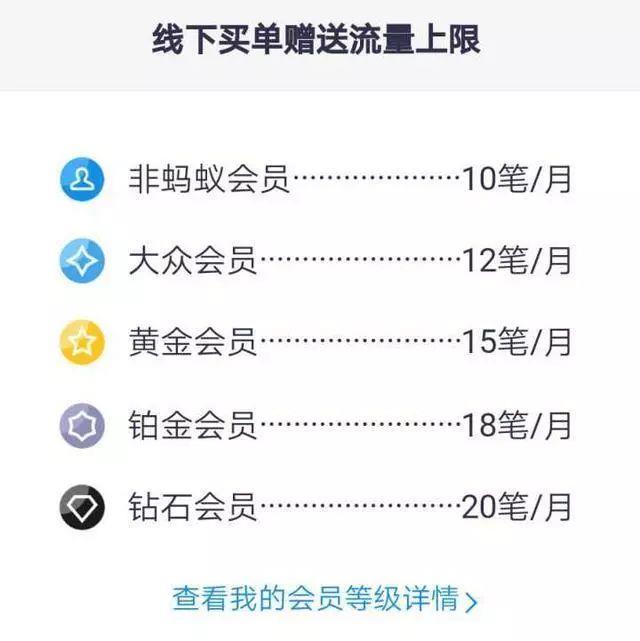 方法:通过支付宝线下买单,联通用户每单送10M。根据支付宝会员等级,非会员每月赠送10次(100M流量),最高的钻石会员赠送20次(200M流量)