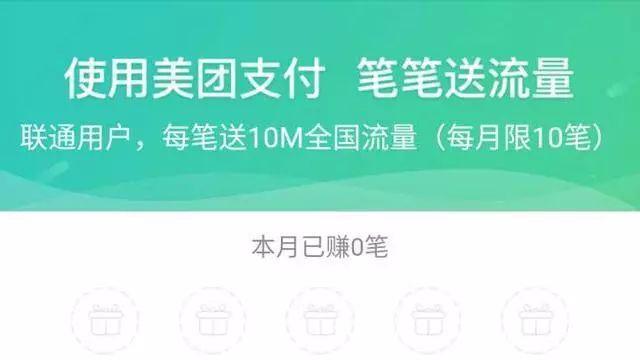 方法:使用美团支付,联通用户每笔送10M全国流量。每月最多可以获取10次,最多领取100M免费流量 。