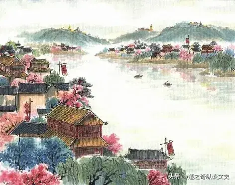 地域辽阔的江南,到处莺歌燕舞,绿树红花相映,水边村寨山麓城郭处处酒旗随风飘动。浪漫而又短暂的南朝六代曾修建了几百座规模浩大建筑精美的寺庙, 如今还存有多少座笼罩在这烟雨蒙蒙的水雾之中呢?