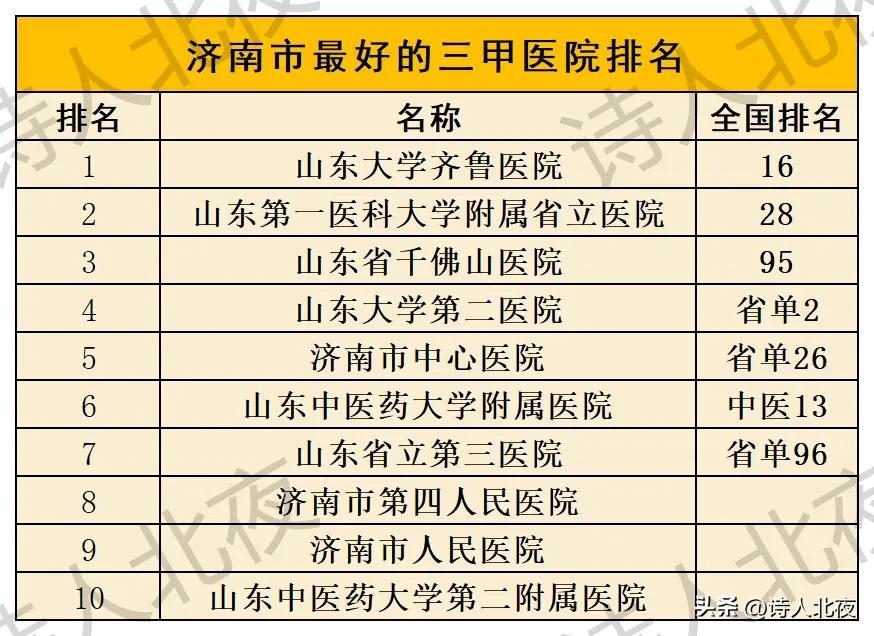 以上就是济南市顶级三甲医院前10名,其中齐鲁医院、省立医院位列全国前50名;千佛山医院位列全国前100名;山东大学第二医院位列全国省单医院第2名,这些都是济南市顶级医疗水平的体现,使得济南市成为省内医疗水平最高的城市。