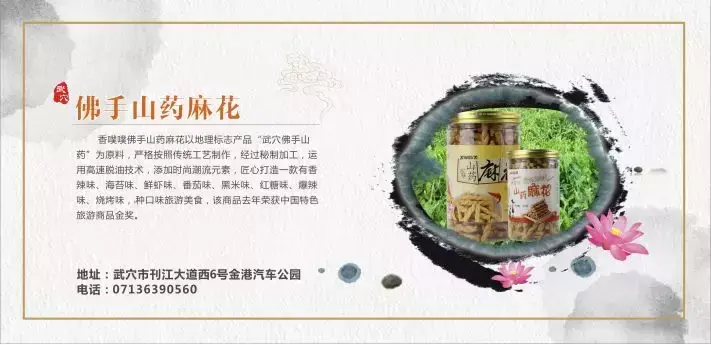 此次活动,武穴将有国家特色旅游商品佛手山药麻花,以及武穴酥糖、武穴发饼、佛手山药乳、佛手山药面、立飞孔雀、一尖香生态秧荪米等旅游商品参展,此外这次活动还得到了湖北美雅食品公司、湖北香噗噗健康产业股份有限公司、宏森集团、广济旅行社、湖北益可味食品有限公司、湖北四祖泉食品科技发展有限公司、兴章竹艺等公司大力支持和赞助。
