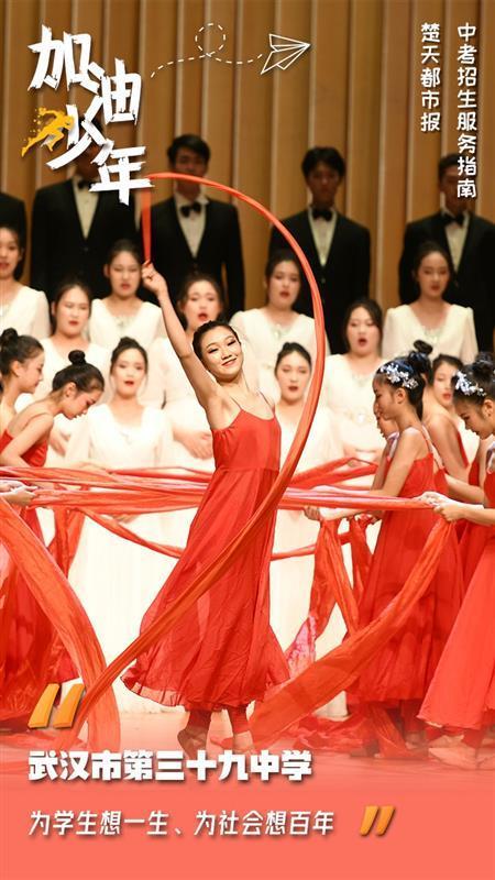 艺术特色让这所百年老校的师生熠熠生辉。在去年的黄鹤美育节暨武汉市第十二届学校艺术节优秀文艺节目展演中,三十九中舞蹈教师张炜乔、柳婧、徐颖指导的原创作品《此间的青春》不负众望,取得中学组第一名的好成绩。现代舞、民族舞、集体朗诵、民乐合奏、课本剧……该校连续19年举办校园艺术节,经常“一票难求”,曾7次在湖北剧场开展大型文艺汇演。