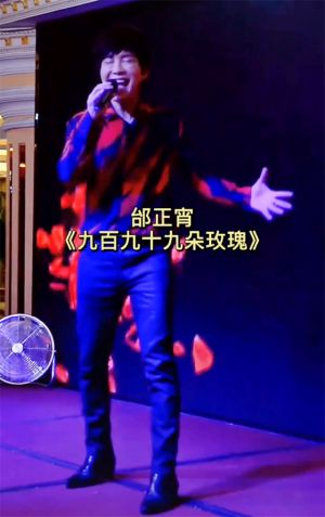 只见邰正宵手上举着鲜花,卖力地演唱他的经典曲目《千纸鹤》。一曲结束后,他又脱掉外套,一边随着音乐挥动手臂,一边深情地唱着70后、80后几乎人人知晓的歌曲《九百九十九朵玫瑰》。