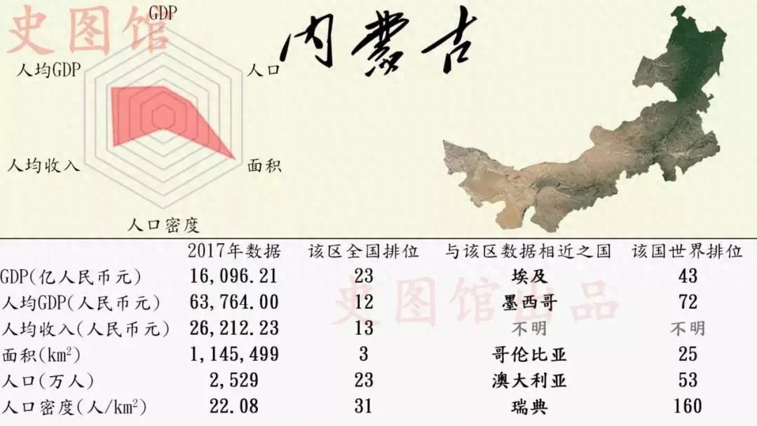 2017年内蒙古自治区的GDP为16096.21亿元(人民币),在当年全国各省区市的GDP排行榜中位列23名,这一数据与埃及2017年的GDP相近,而埃及在当年世界各国的GDP排行榜中位列43(数据来源:微信公众号共青团中央)。