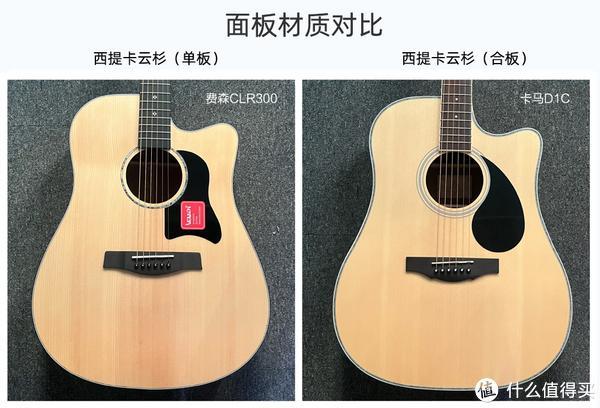 从板材上来说,卡马D1C使用的是西提卡云杉合板材质,而 VEAZEN费森CLR300则采用的是更为昂贵的西提卡云杉单板。合板材质声音比较分散不集中,共鸣较差些,而面单的面板共鸣则饱满更好。同时两款都是哑光漆面工艺,非常有质感。