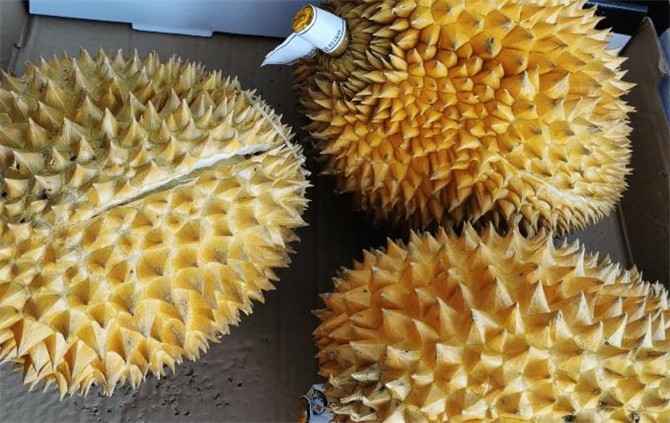 接下来,看颜色。成熟的榴莲通常呈黄色或绿色。如果榴莲呈暗黄色或黑色,可能是过熟或腐烂的,不建议购买。
