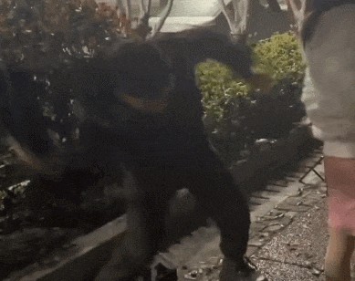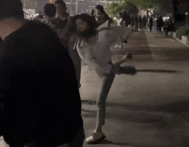 或许是觉得力度不够大,她打了一次又后退几步,然后快速蓄力、抡圆胳膊再次抽打,同时嘴里还喊着:“1、2、3”。