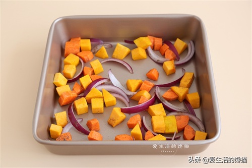 1,南瓜切小块,胡萝卜切小块,洋葱切丝,放入烤盘里,倒入少许橄榄油和黑胡椒粉,盐拌匀。