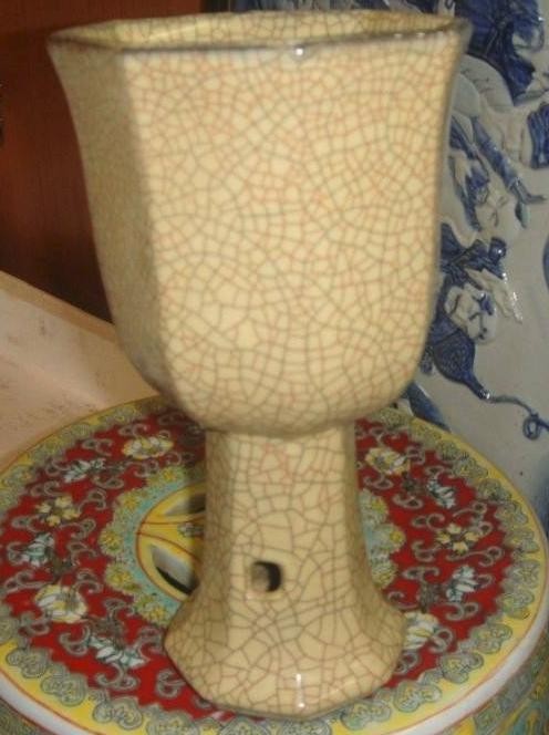 仿哥窑八方高足杯为成化时期新创品种,釉面虽仿造宋朝哥釉,但其釉质肥润,平整光亮,光泽度较强,有宋朝哥窑的“酥润含蓄”之美。口、足釉色及金丝铁线纹也较宋朝哥窑片纹规整,少之天成之趣。其价值也非常的高,但与之宋朝哥窑相比稍逊风骚。让人不仅感慨:既生瑜何生亮!
