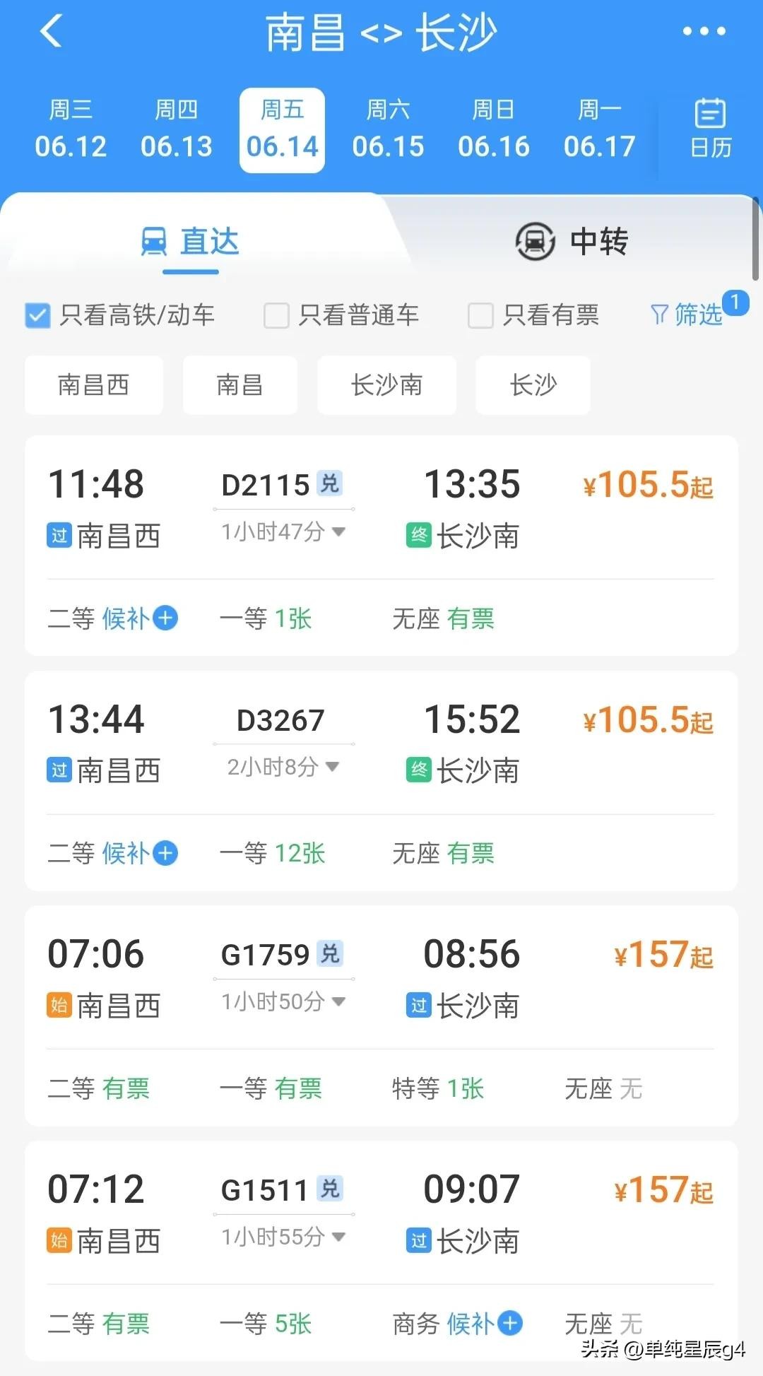 铁路12306消息:2024年6月15日起沪昆高铁南昌至长沙段的“G”字头高速动车组将实行票价折扣有升有降,二等座票价由原先的157元,最多降至126元。除了原先的两对“D”字头动车组的105元,南昌至长沙高铁的折扣列车增加,更有性价比。