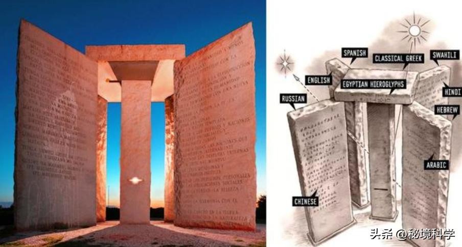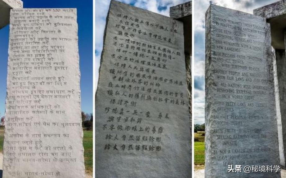 在美国,人们就曾发现过这样一个被叫做“末日之石”的建筑,乔治亚末日之石。乔治亚引导石上却使用了近代几乎不再使用的古老语言,其中就包括中文。翻译过来的意思就是“这里将指引人类去往一个理性的时代”。最重要但是,在巨石阵的旁边有一块石板,上面说道“在石板下方6英尺处埋有一个时空胶囊”,却并没有表明人类开启的时间。对于这个“末日之石”,无数阴谋论和神秘学说围绕着它,有人相信是玫瑰十字会的作品,有人认为是撒旦的产物,开启人类消减计划。