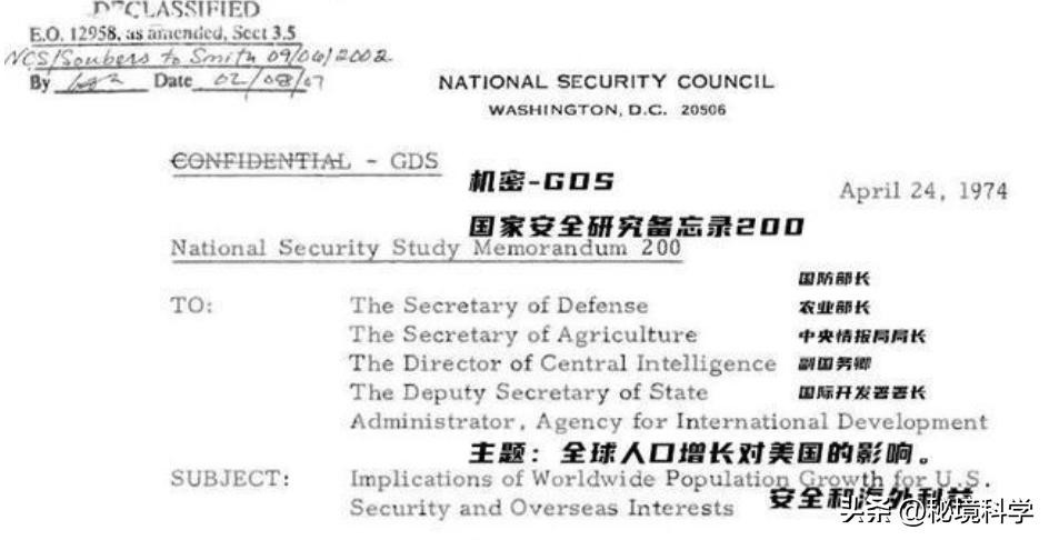 就在石碑建成的六年前,1974年美国提出了一项秘密策略,国家安全研究备忘录第200号。实施世界人口行动计划,据《基辛格报告》估计,美国在1965年至2004年间花费173亿美元控制发展中国家人口。