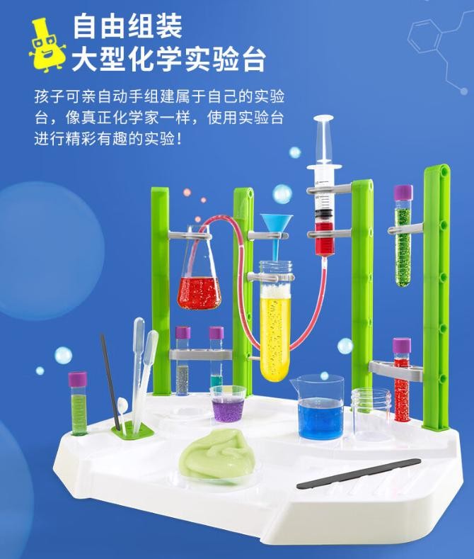 套盒实验涵盖广泛的化学主题,包含晶体、气体、颜色、酸碱、分析物质五大研究主题,带领小朋友们走进迷人的化学世界,孩子可亲自动手组建属于自己的实验台,像真正化学家一样,使用实验台进行精彩有趣的实验!