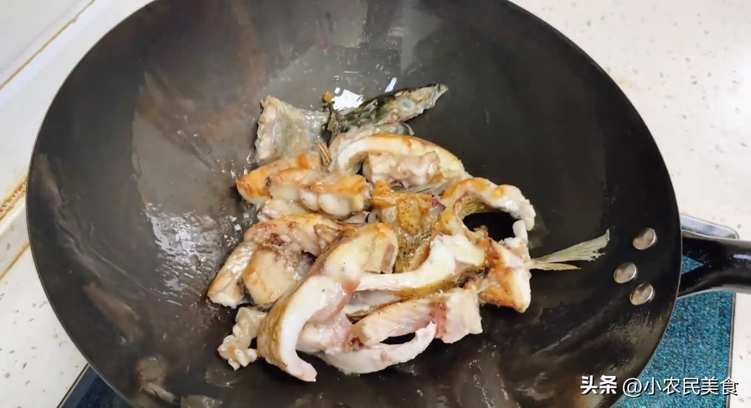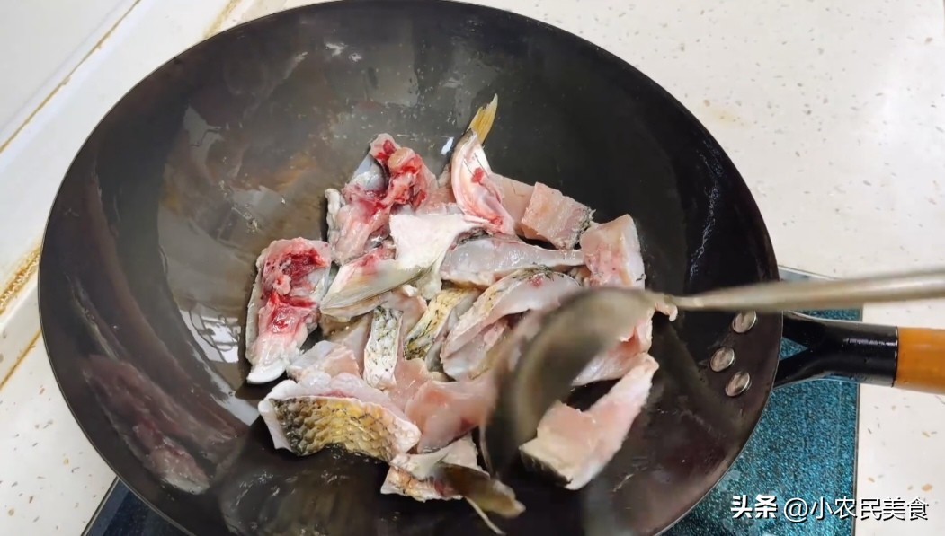 3、在煎鱼的过程中,要不断地转动锅子,让鱼块受热均匀,这样才能煎出金黄酥脆的鱼块,煮出奶白色的鱼汤。