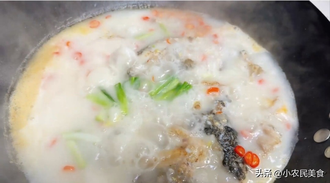 2、接着加入切好的小米辣(不吃辣的朋友可以不放),这个时候需要加配菜的也可以加入自己喜欢的配菜继续煮,你会发现汤汁会越来越白,散发出浓郁的香味。