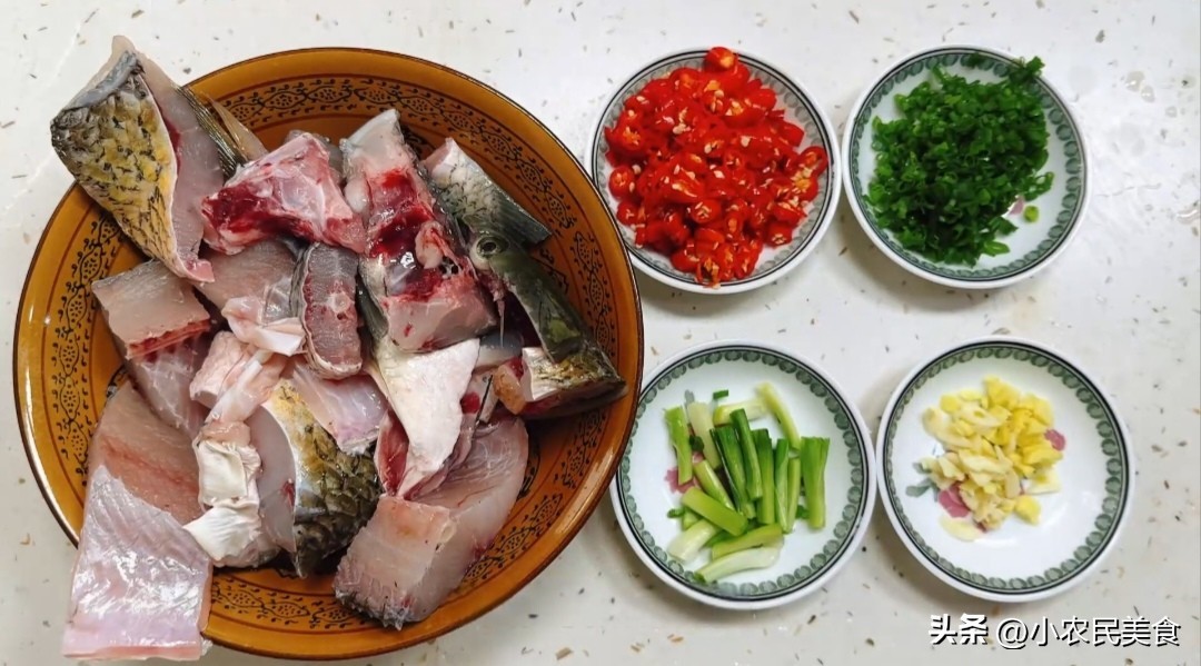 首先,我们需要准备一条两斤左右新鲜现杀的黄皮草鱼,因草鱼肉质鲜嫩,是制作鱼粉的绝佳选择。配料方面,我们要准备几根小葱,葱头切段,其余切成葱花;老姜和大蒜子拍散后切碎;十个小米辣切碎(不吃辣的朋友可以省略这一步),(配菜方面还可以加入大白菜,丝瓜,冬瓜片)等,这些配料不仅能增添鱼粉的风味,还能起到去腥增香的作用。