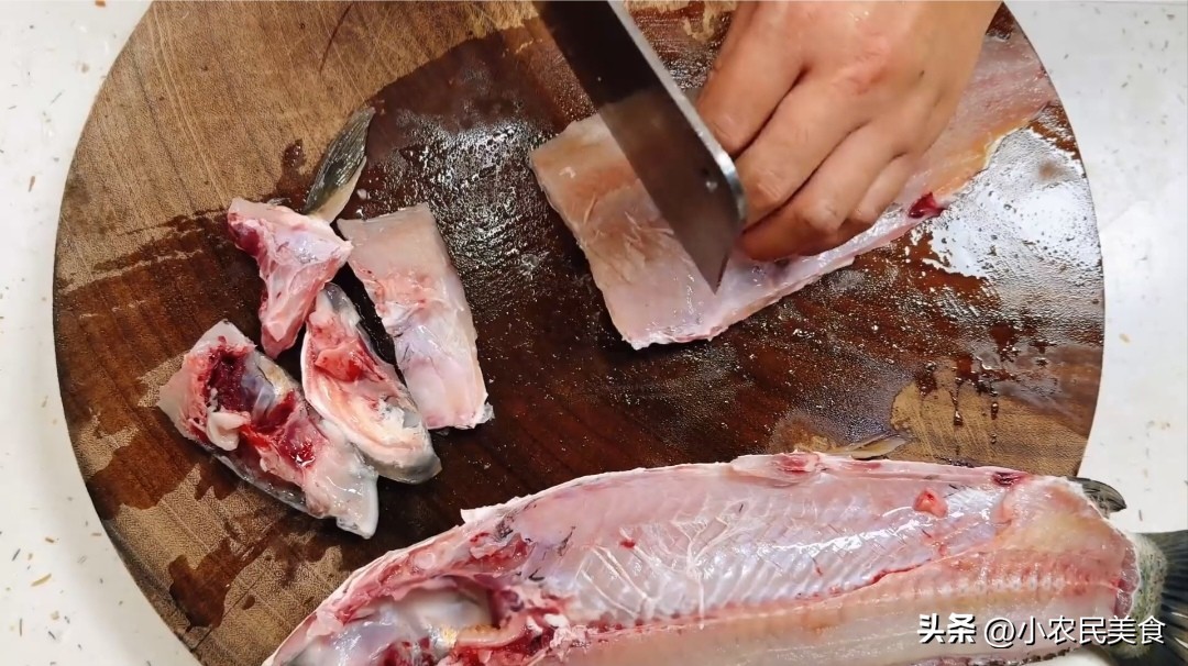 鱼的处理是关键步骤,鱼的腥味主要来自鳞片、内脏、黑膜和牙齿,所以我们要仔细地去掉鳞片,清理干净内脏和黑膜,同时把牙齿也去除掉,然后用清水将鱼身上的残血冲洗干净。洗干净的鱼放在菜板上,一分为二,把鱼头和鱼肉砍成小块。在砍鱼的时候,动作要快,姿势要帅哦!砍好的鱼块放入碗中备用。