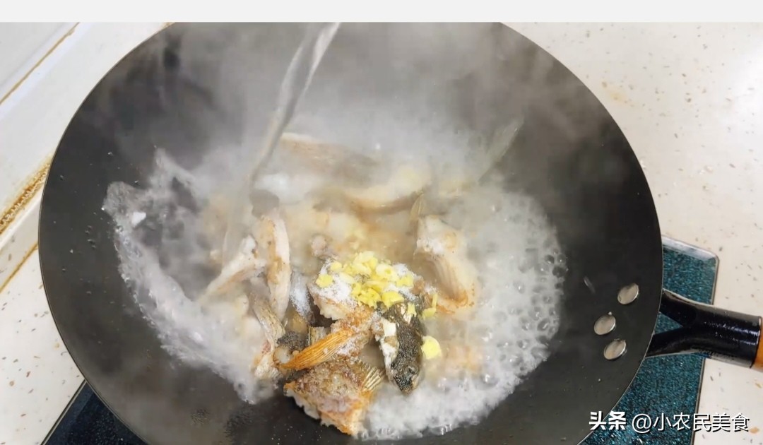 1、鱼煎好后,倒入姜蒜爆香,然后加入烧开的高汤(如果没有高汤,用矿泉水代替也可以)。盖上锅盖,大火烧开,煮3分钟左右。