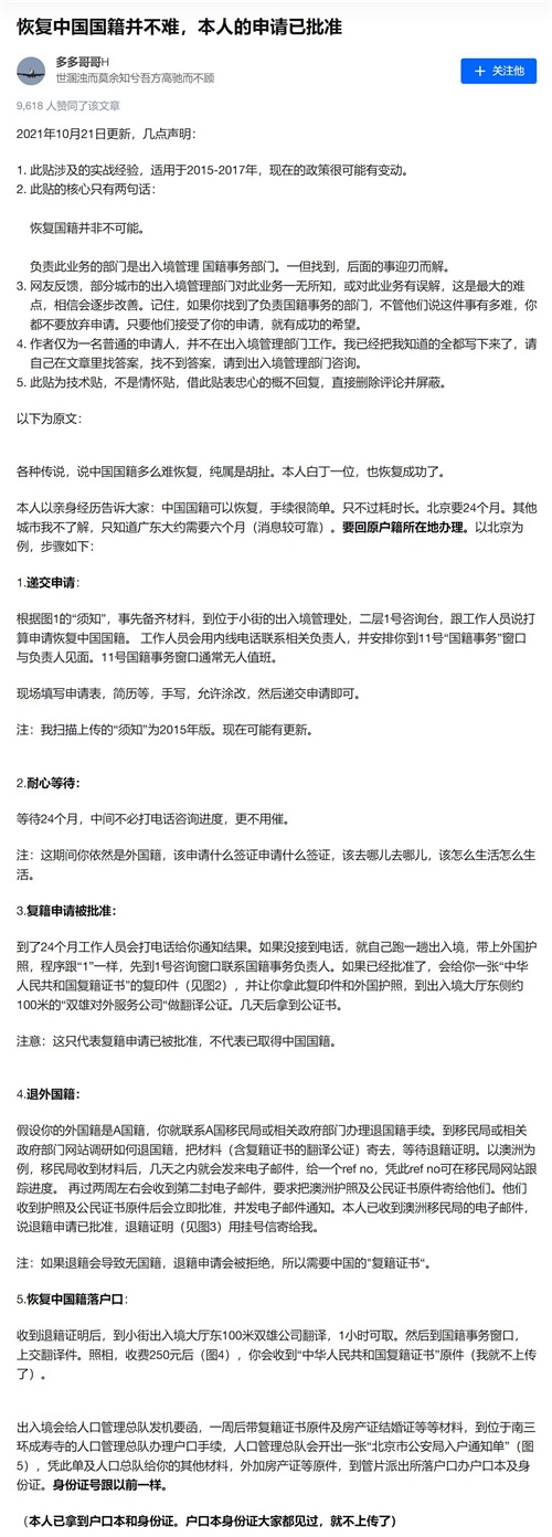 “本人以亲身经历告诉大家:中国国籍可以恢复,手续很简单。只不过耗时长。北京要24个月。其他城市我不了解,只知道广东大约需要六个月(消息较可靠)。”