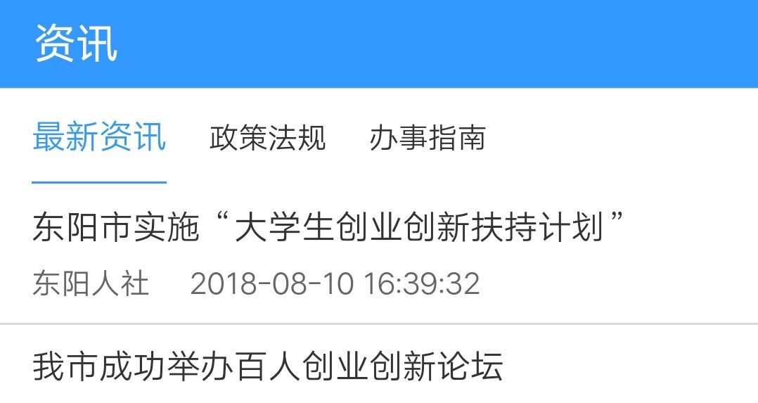 点开“资讯”模块后,可以看到最新资讯、政策法规、办事指南等栏目。