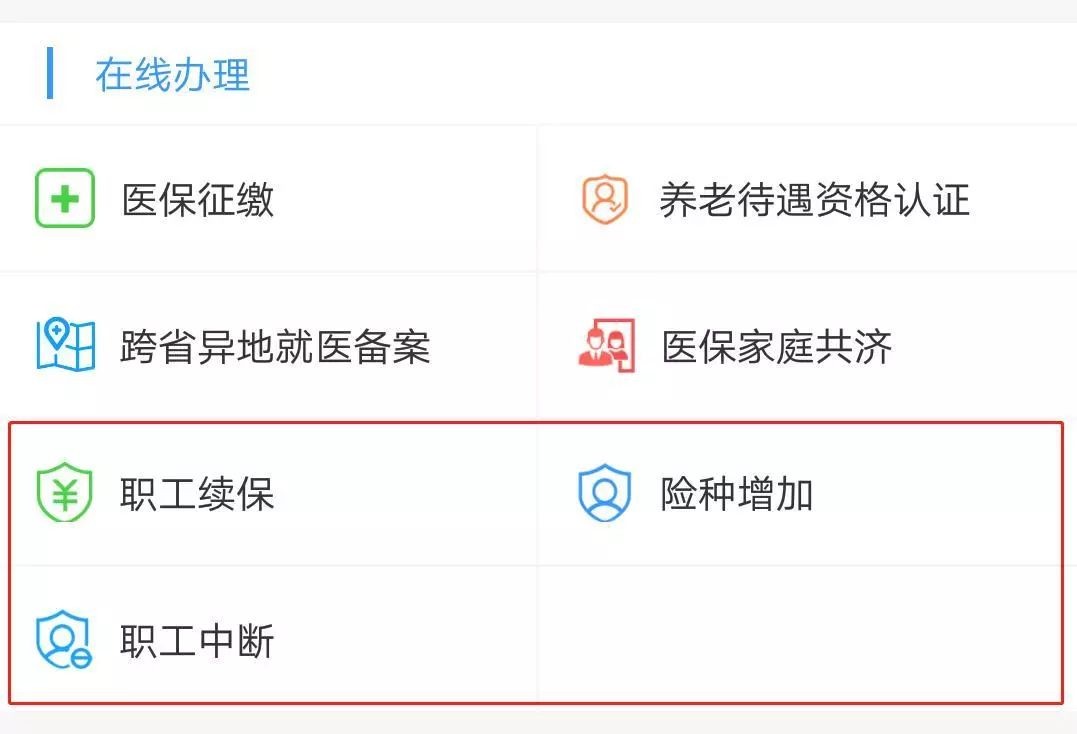 而在“在线办理”事项中,增加了“职工续保”“险种增加”“职工中断”三项个体人员办理的业务,已于8月正式上线。