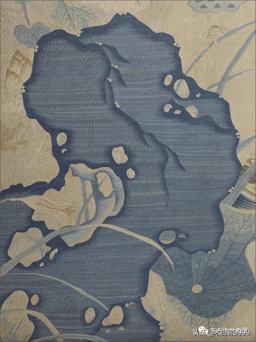 整幅画尺幅极大,受院体画派影响,以春夏生趣盎然的莲塘实景绘成缂丝底稿。全幅以彩色丝线緙织而成,色彩丰富,层次分明,花卉虫鸟惟妙惟肖。所缂丝缕细密适宜,技法高超,堪称古往今来缂丝绘画之杰作,也是朱克柔缂丝画中的传世杰作。