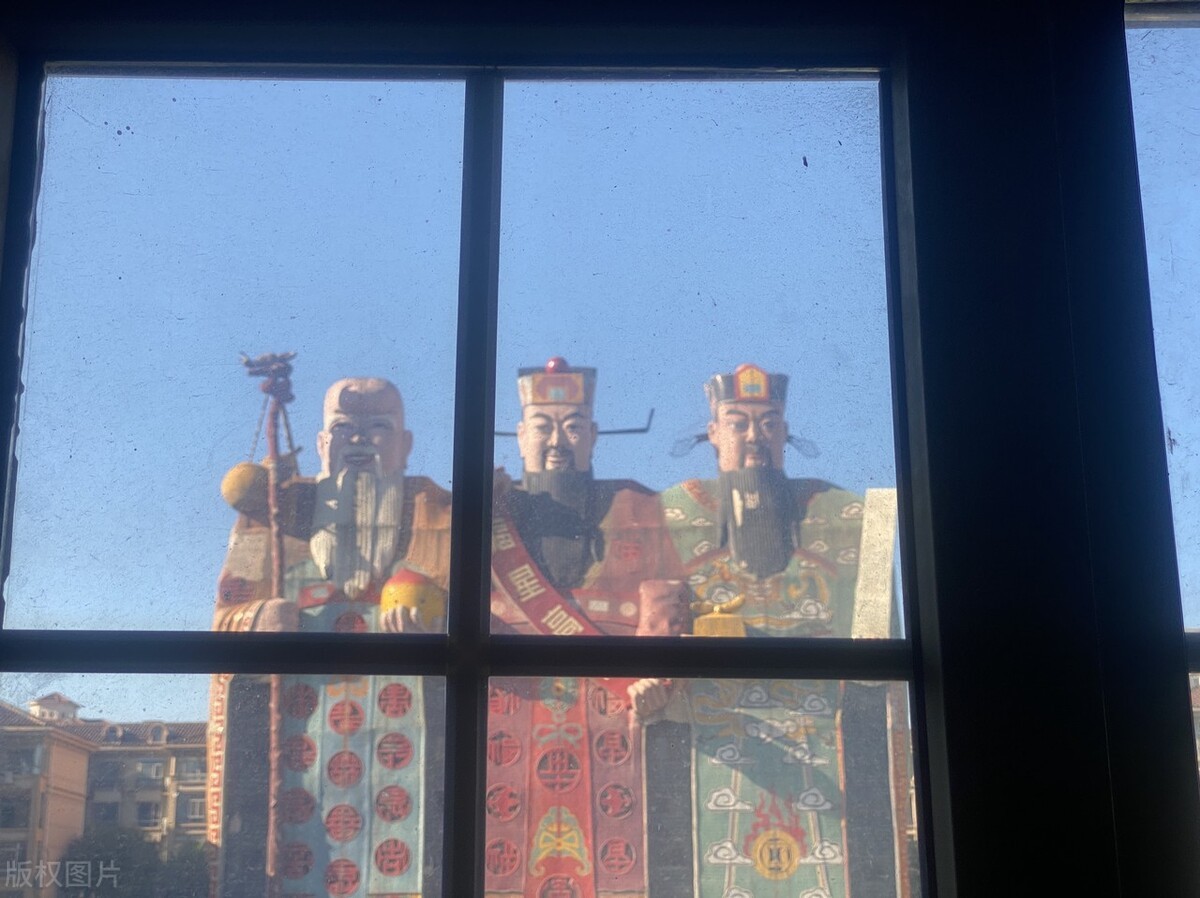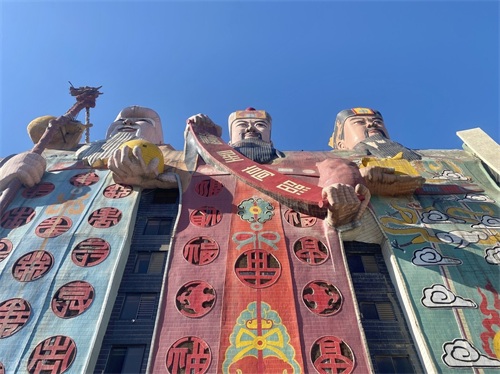 三尊塑像的色彩十分鲜艳,采用了中国传统的吉祥色红色与金色。在阳光下,它们闪闪发光,更显华贵庄重。此外,三尊塑像的设计也充满了中国传统文化元素,如蝙蝠、寿桃、云纹等,将福禄寿的寓意表达得淋漓尽致。