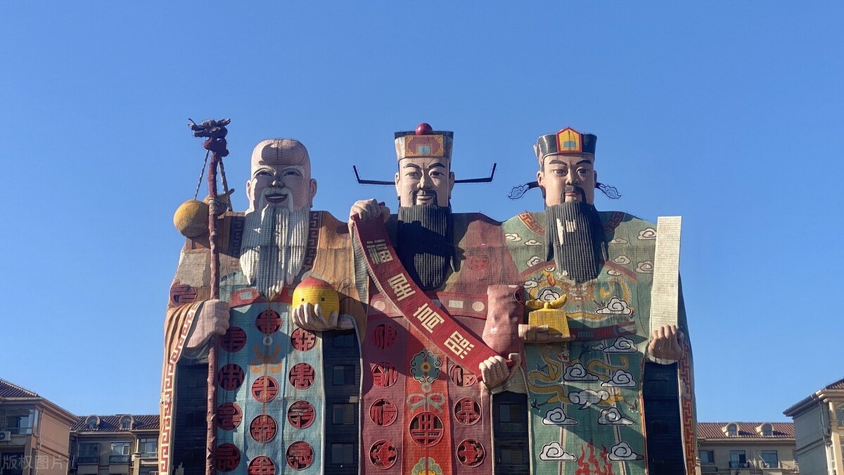 这座彩塑高二十七米,由三尊不同形象的人物组成。中央的福星手托桃腮,面带微笑,神态安详,代表着幸福与祥和。左侧的禄星则是长须飘逸,头顶高帽,显得风度翩翩,富有智慧。右侧的寿星则白发苍苍,面容和蔼,手持仙桃,寓意着长寿与健康。