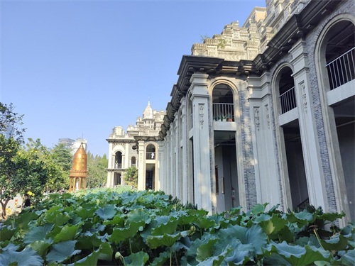 古寺被荷池衬托得更养目。
