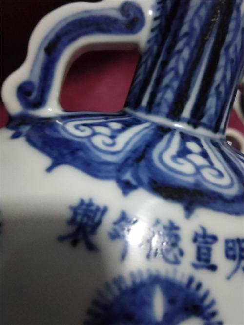其二,结晶斑又叫铁锈班,是青料颗粒粗大所致。如果用强光侧照可明显看出结晶斑,实际上就是青料中斑块成颗粒状的锈斑。其形成原因是因为含铁元素过高而导致。铁锈斑一般容易出现在起笔落笔、或转折的地方。两笔交汇的地方最为明显。永乐,宣德时期的苏麻离青料有粗有细,青料均匀则无结晶斑,而着色浅淡,反之不然。另外永乐,宣德青花瓷器多以小笔蘸料,绘画时要不停的蘸料,从而形成结晶的几率极高,釉色浓淡不一极其明显。瓷胎表面形成铁锈斑,说是苏麻离青的特征还不如说是一种缺陷。