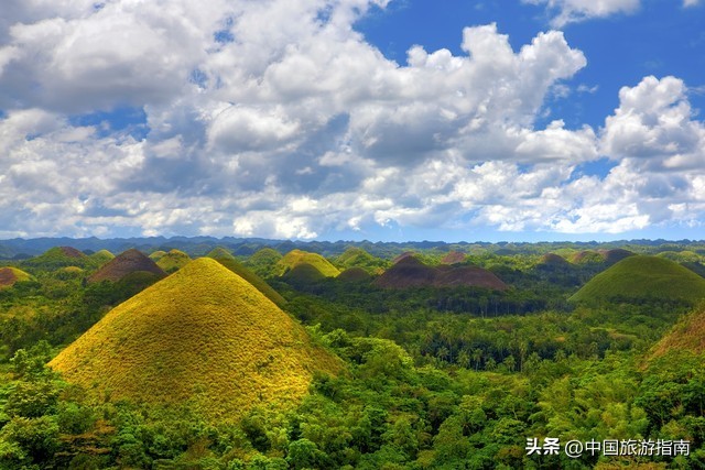 巧克力山位于菲律宾的保和岛,它是一处著名的自然景点。它由大约1268个小山丘组成,这些山丘高度在40米至120米之间,直径在25米至50米之间。巧克力山的形成原因至今尚无定论,但有几种假设。一种观点认为,这些山丘是古代海底火山喷发形成的;另一种观点认为,它们是由风化、侵蚀和沉降作用形成的。由于山丘上覆盖着一层厚厚的棕色草皮,在干燥的季节,这些草皮会变成棕色,如同一排排巧克力排放在大地上,因此得名“巧克力山”。
