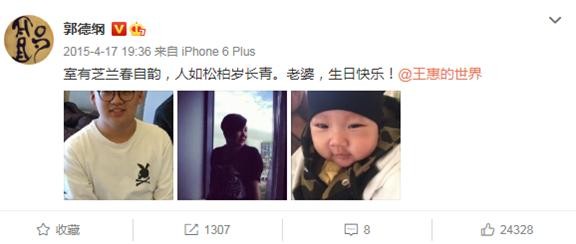2015年4月17日,郭德纲发文:“室有芝兰春自韵,人如松柏岁长青。老婆,生日快乐!”
