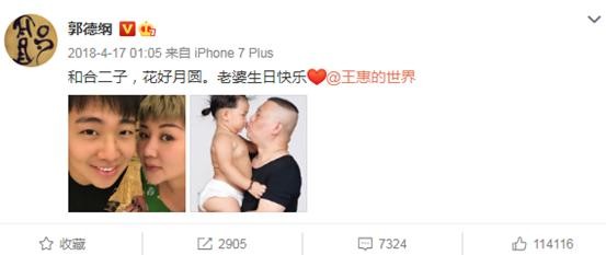 2018年4月17日,郭德纲发文:“和合二子,花好月圆。老婆生日快乐。”