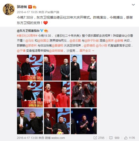 2016年4月17日,郭德纲发文:“今晚7:30分,东方卫视播出德云社20年大庆开幕式。昨晚演出,今晚播出,感谢东方卫视的支持!”
